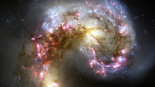 Галактика Антенн ( NGC 4038 и 4039 ) получила своё название благодаря двум огромным длинным выбросам пыли и газа, которые вырваны из этих галактик в процессе слияния. Изначально, несколько сот млн. лет назад, это были две отдельные галактики, которые начали постепенное сближение и слияние друг с другом. Сейчас уже трудно различить, но похоже, что NGC 4038 была классической спиральной галактикой, а её соседка - спиральной с перемычкой. При столкновении галактик, вероятность столкновения звёзд друг с другом крайне мала. Вместо этого сталкиваются протяжённые облака газа и пыли, что даёт толчок к звездо - образованию. В этой галактике как раз и обнаружены области активного звездо - образования. Любопытно и то, что через миллиарды лет, такая же участь ждёт наш Млечный путь и Туманность Андромеды.