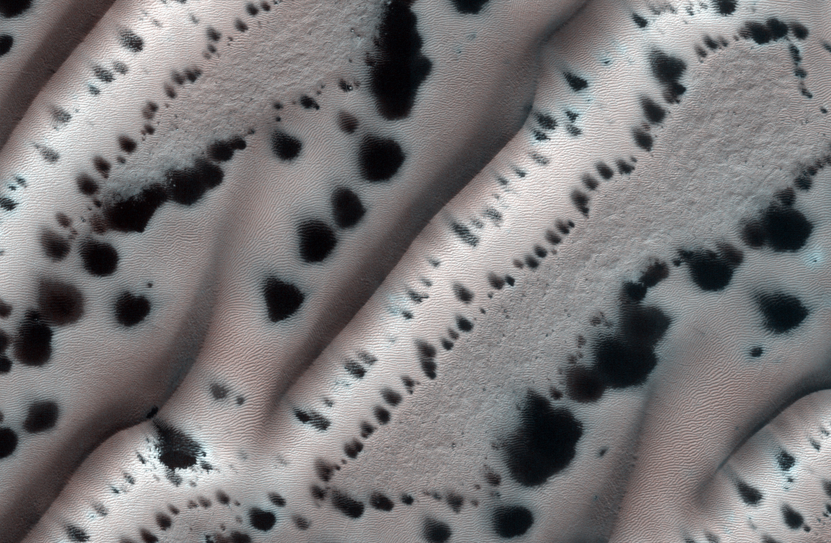 Это песчаные дюны с шапкой из замерзшего углекислого газа во время поздней зимы на Марсе, когда начинается сублимация углекислоты ( переход из твёрдого состояния сразу в газообразное, минуя жидкое ). Как бы то ни было, механизм сублимации достаточно сложен и проявляется в виде пятен или каналов, аллювиальных конусов выноса, и т.д.