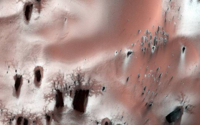 Так же как и на Земле, ледяной покров, накопившейся во время зимы, исчезает с приходом лета на Марсе. Впрочем, большая часть ледяного покрова на Марсе не состоит из снега и льда - на Марсе это диоксид углерода ( также известный как “сухой лед” ). На этом изображении мы можем видеть очаги сублимации ( маленькие черные точки, подвергшиеся сублимации и оголившие темный грунт ). Также хорошо видны мелкие разводы, образованные потоками извергаемого газообразного диоксида углерода вместе с частицами темного грунта, который впоследствии раскидывается на ледяной поверхности ветром ( поэтому виды разводов указывают на направление ветров на данном участке ).